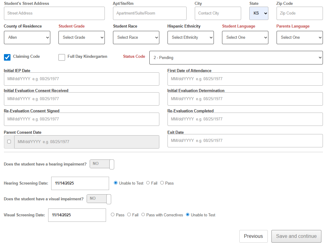 Step 2: Enter all the student information and select Save and continue. Please select the KIDS ID not available if the KIDS ID is unknown at this time.