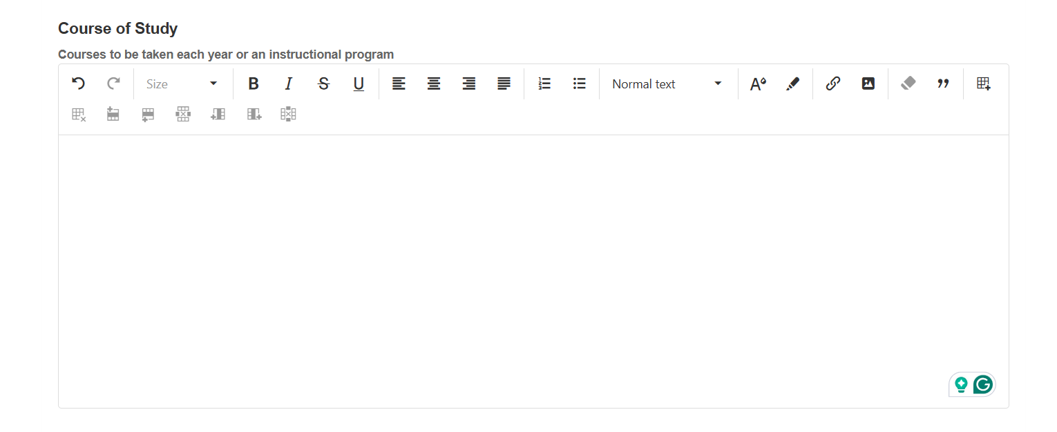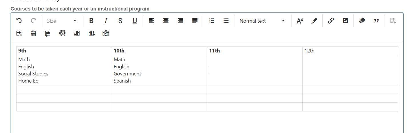- Type your course of study information (e.g., “9th Grade – English I, Algebra I, Biology, PE, Art”).